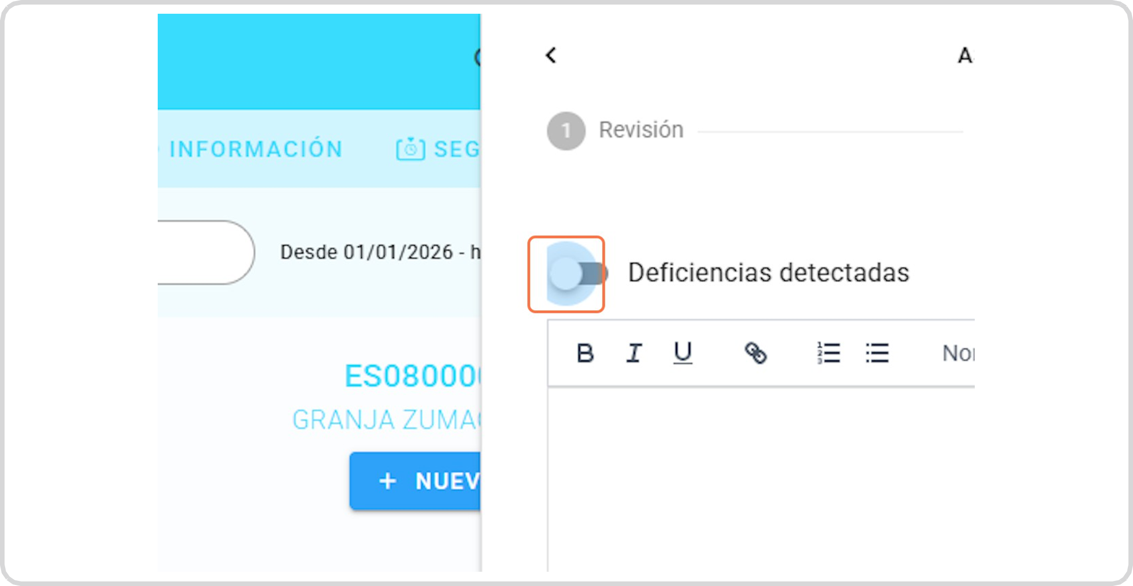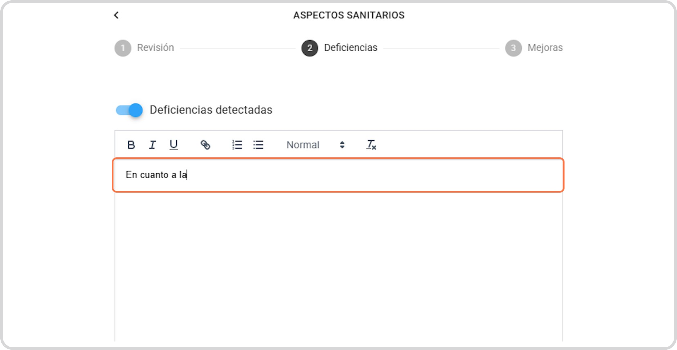 Si hubiera deficiencia detectada la indicamos y describimos en el campo de texto: