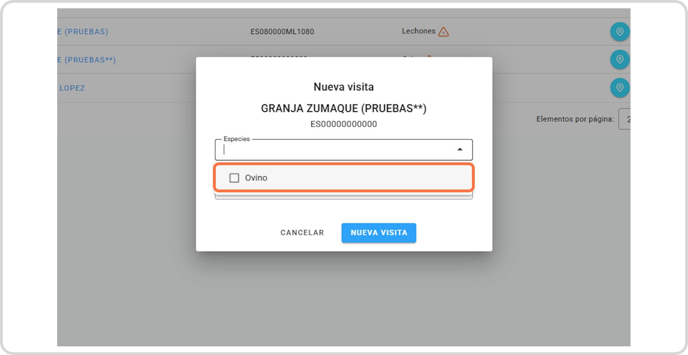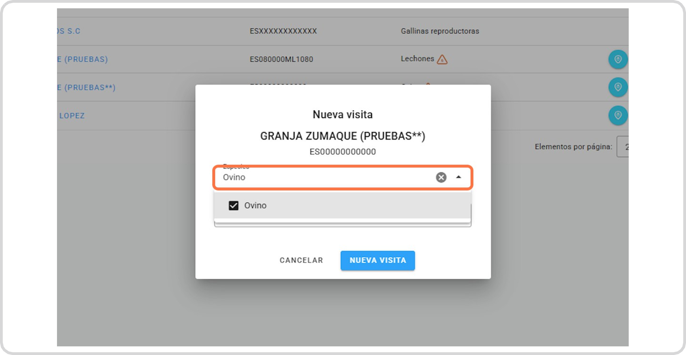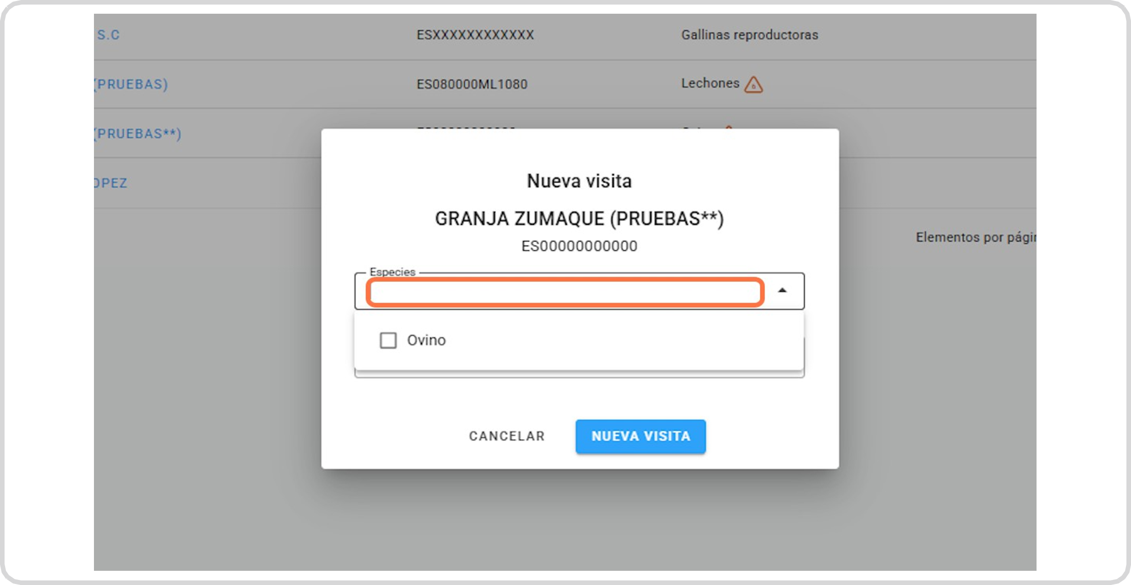 Selecciona la especie a la que vas a hacerle la visita zoosanitaria