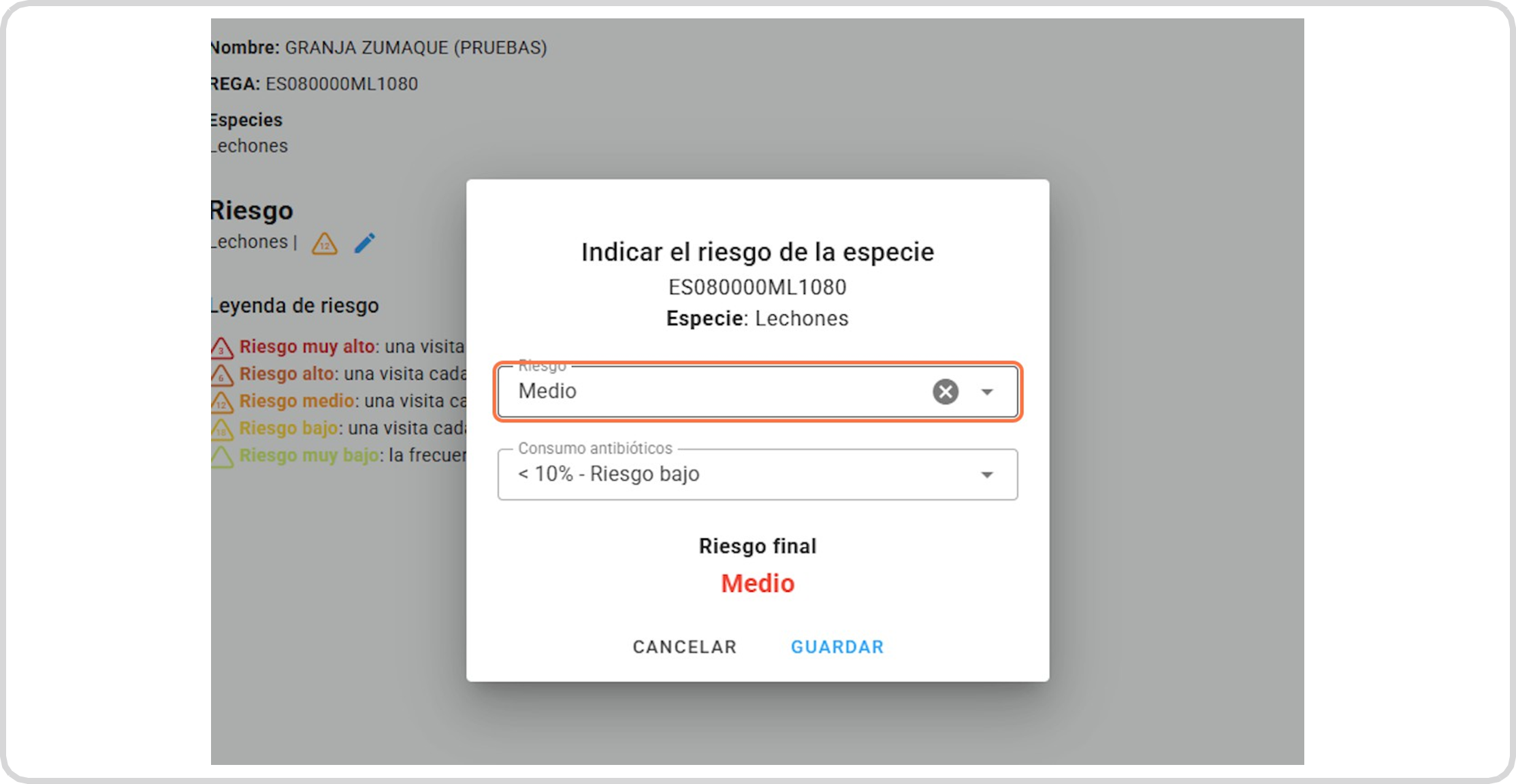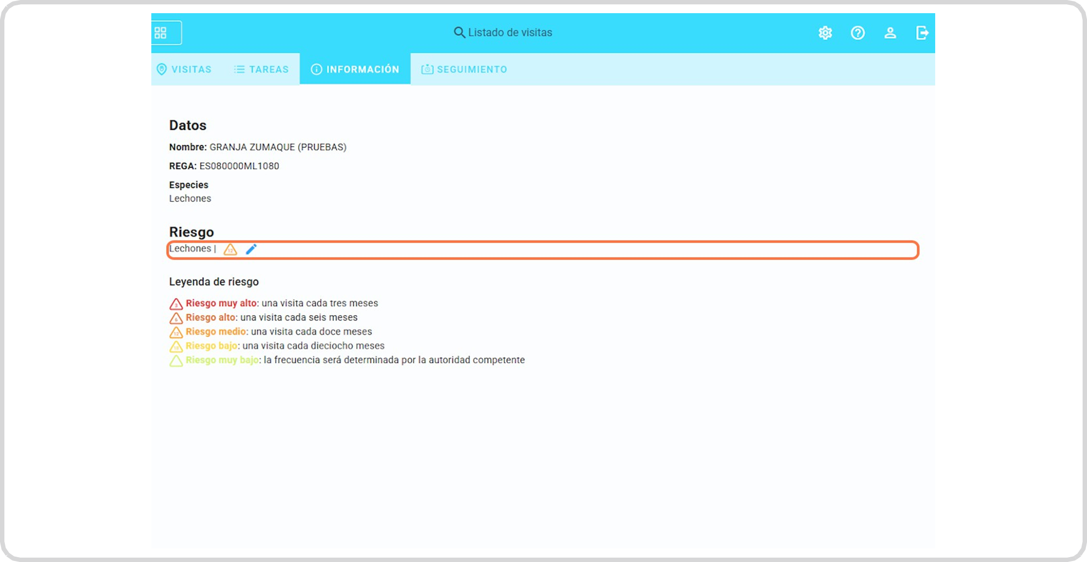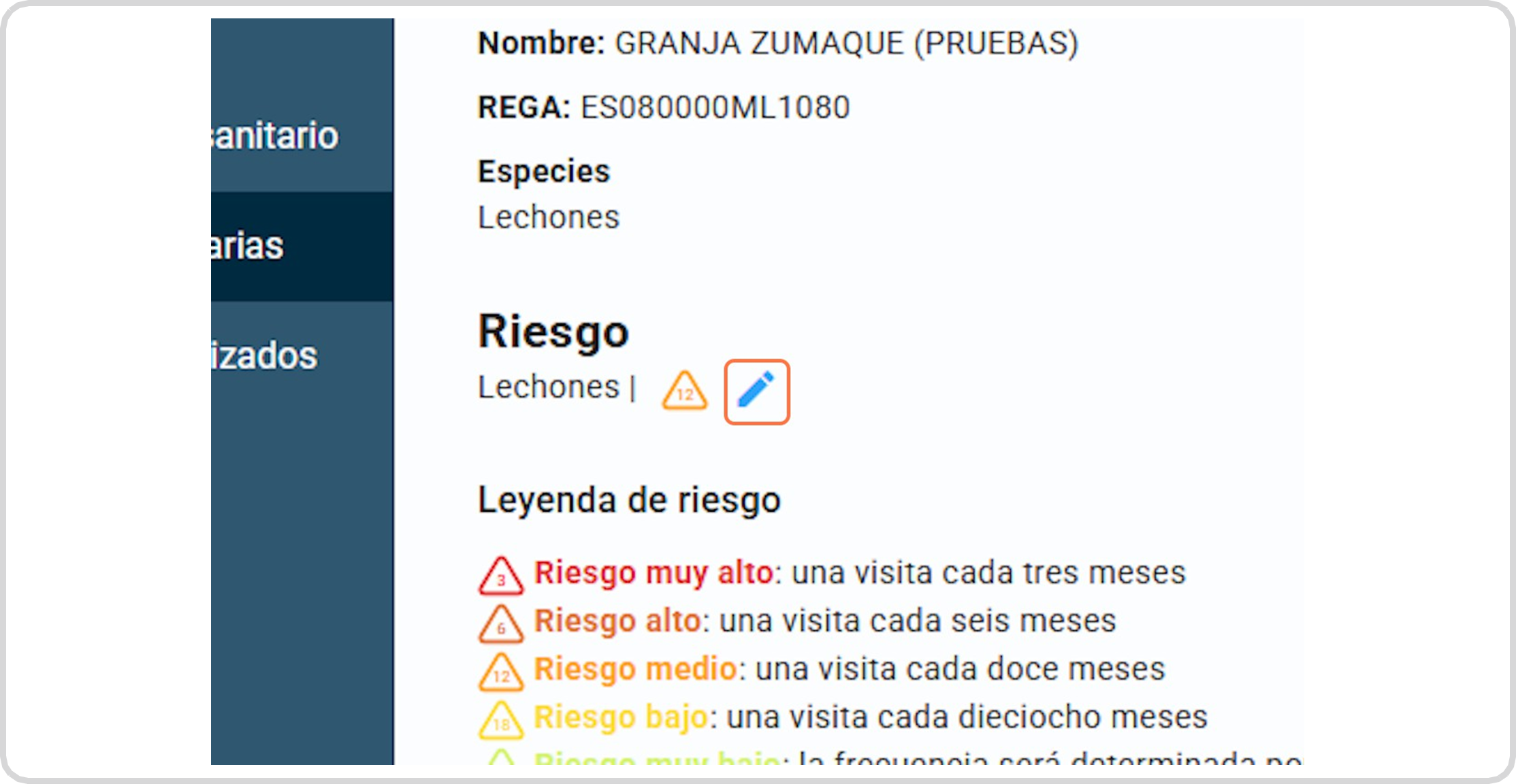Encontrarás la pestaña de Información donde podrás categorizar el riesgo de todas las especies que tenga ese REGA. Desde el lápiz podrás editarlo:
