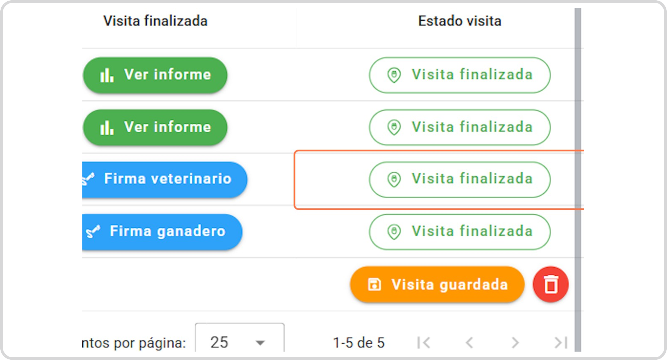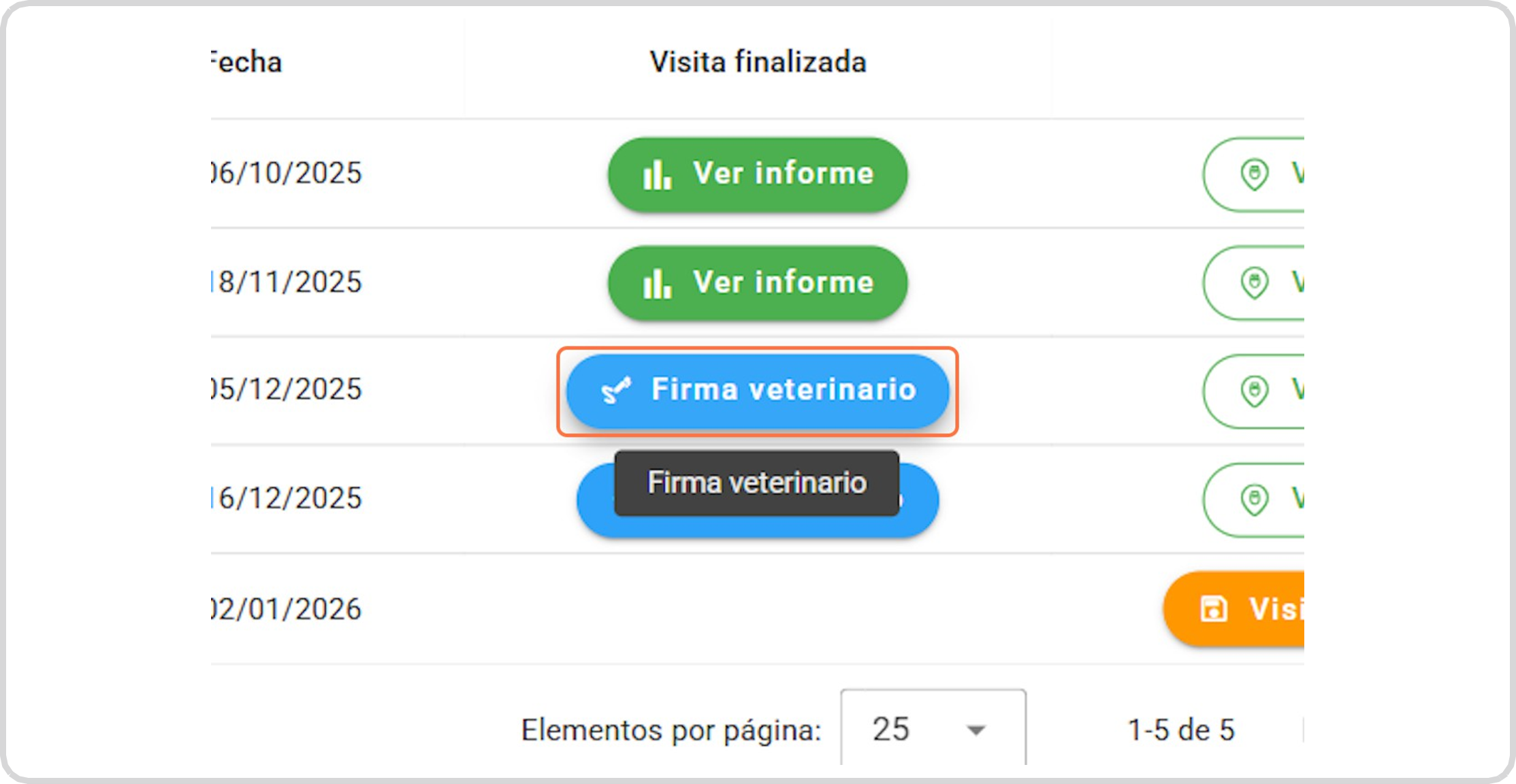 El estado de la visita será finalizado - firma veterinario. Hacemos clic en firma veterinario, se desplegará todo el informe que podrás revisar y al final del documento tendrás firma digitalmente: